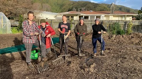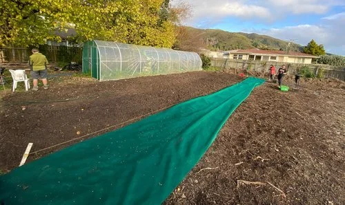 We removed the top layer of soil, then used broadforks to loosen the soil enough to pull out the couch grass roots. After the weeds were removed, we used a combination of soil conditioners and fertiliser such as blood & bone, gypsum and a special fish brew from Jules Matthews of Mangaroa Farms. We followed this with a cover crop of peas, oats, phacelia, mustard, lupin and buckwheat, then covered to allow it to germinate. We spray more of the fish brew every two weeks, as per the advice from Jules. In Spring we will cut the cover crops back and dig them into the soil, then we can start to assess how well this process has worked.